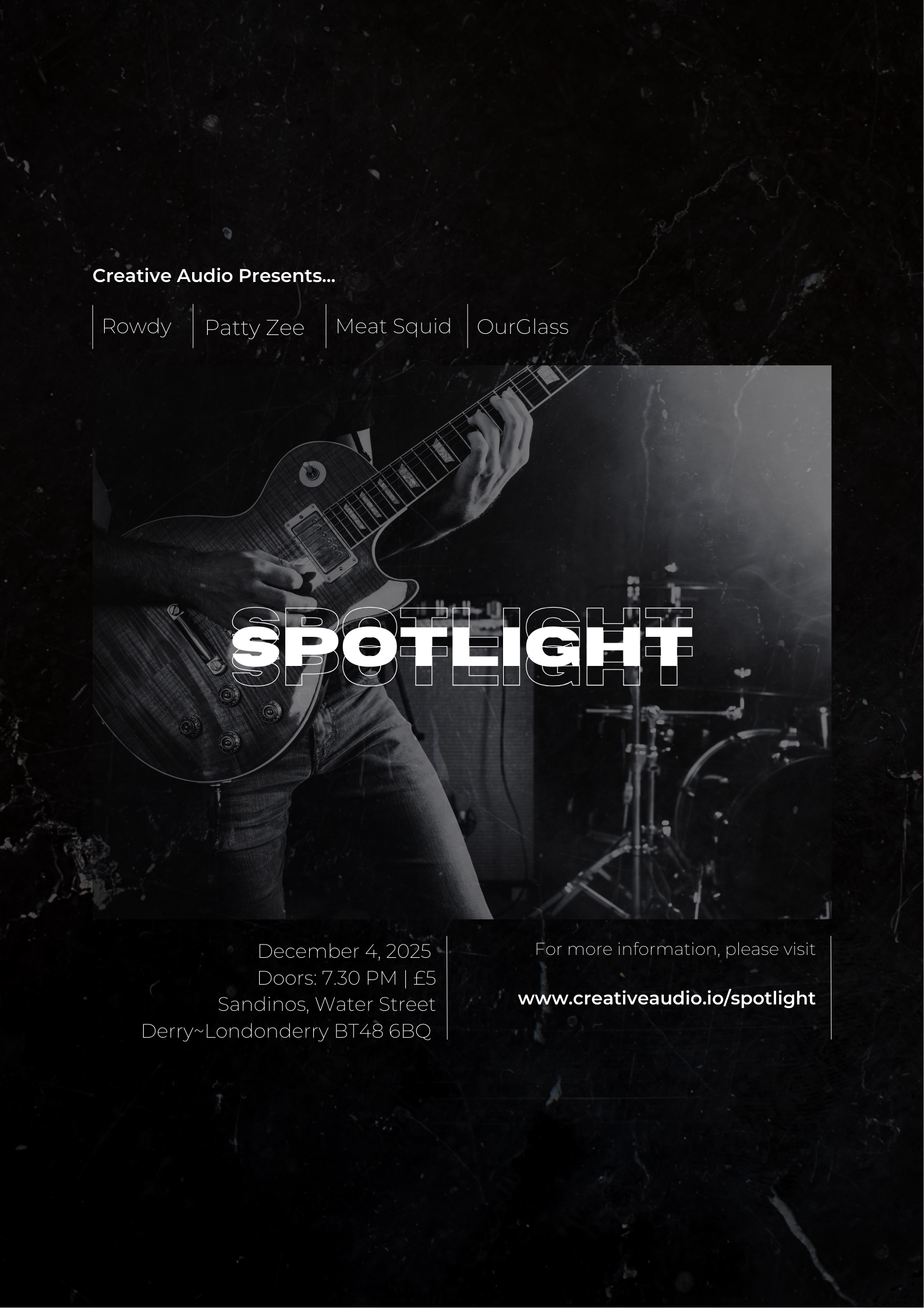 Spotlight is a music event focused on presenting and promoting the music professionals of tomorrow. Supported by the Creative Audio programme at Ulster University, Spotlight is dedicated to helping creative people achieve their goals. Allying new talent in music and live sound production with support from Creative Audio staff and professionals from the creative industries guarantees an event that is fresh and diverse.